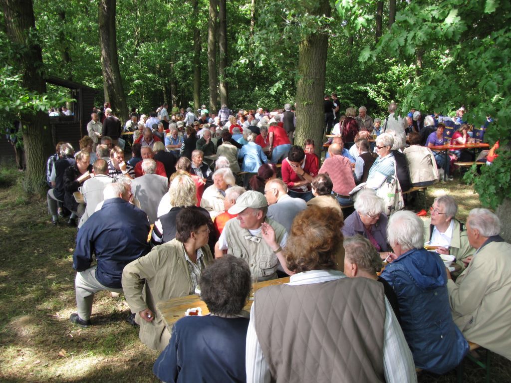Dort erwarteten sie zunächst die Aktiven von den Treppenterriern unter Bubi Reis, die den Platz wie gewohnt hergerichtet hatten und zur Beköstigung der Besucher bereitstanden. Dort waren aber auch die MusikerInnen des Musikzuges und unser Pastor Strack, die das Treffen mit einem Gottesdienst eröffnen wollten.