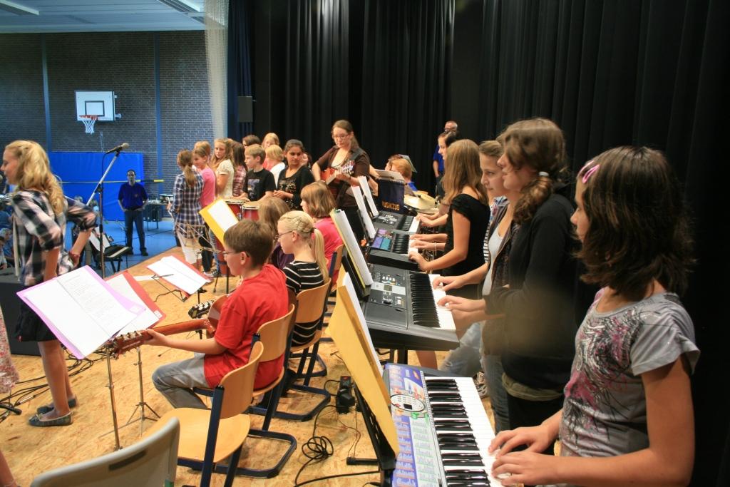 Nun übernahmen die Musikprofile Klassen 5 und 6 der neuen Oberschule unter der Leitung von Daniela Petter, Anja Fricke und Alexander Rath das Programm. Mehrere Keyboarder, Gitarristen und Percusionisten bildeten das Schulorchester. Drei Gesangssolistinnen und ein 10-köpfiger Backroundchor komplettierten die Besetzung. Mit Liedern wie „The Lion sleeps tonight“, Marmor, Stein und Eisen“ rissen sie das Publikum mit. Es folgten moderne Pop Songs wie „Lemon Tree“ und „Waving Flag“, bevor sie mit dem Gospel „Rock my Soul“ das Publikum zum Mitsingen einluden. „Es macht viel Freude zu sehen, mit wieviel Spaß und Engagement die Kinder und Jugendlichen bei der Sache sind“, kommentierte ein Besucher das Geschehen auf der Bühne, als er sich in der Pause in die Schlange für Kaffee und Kuchen einreihte.